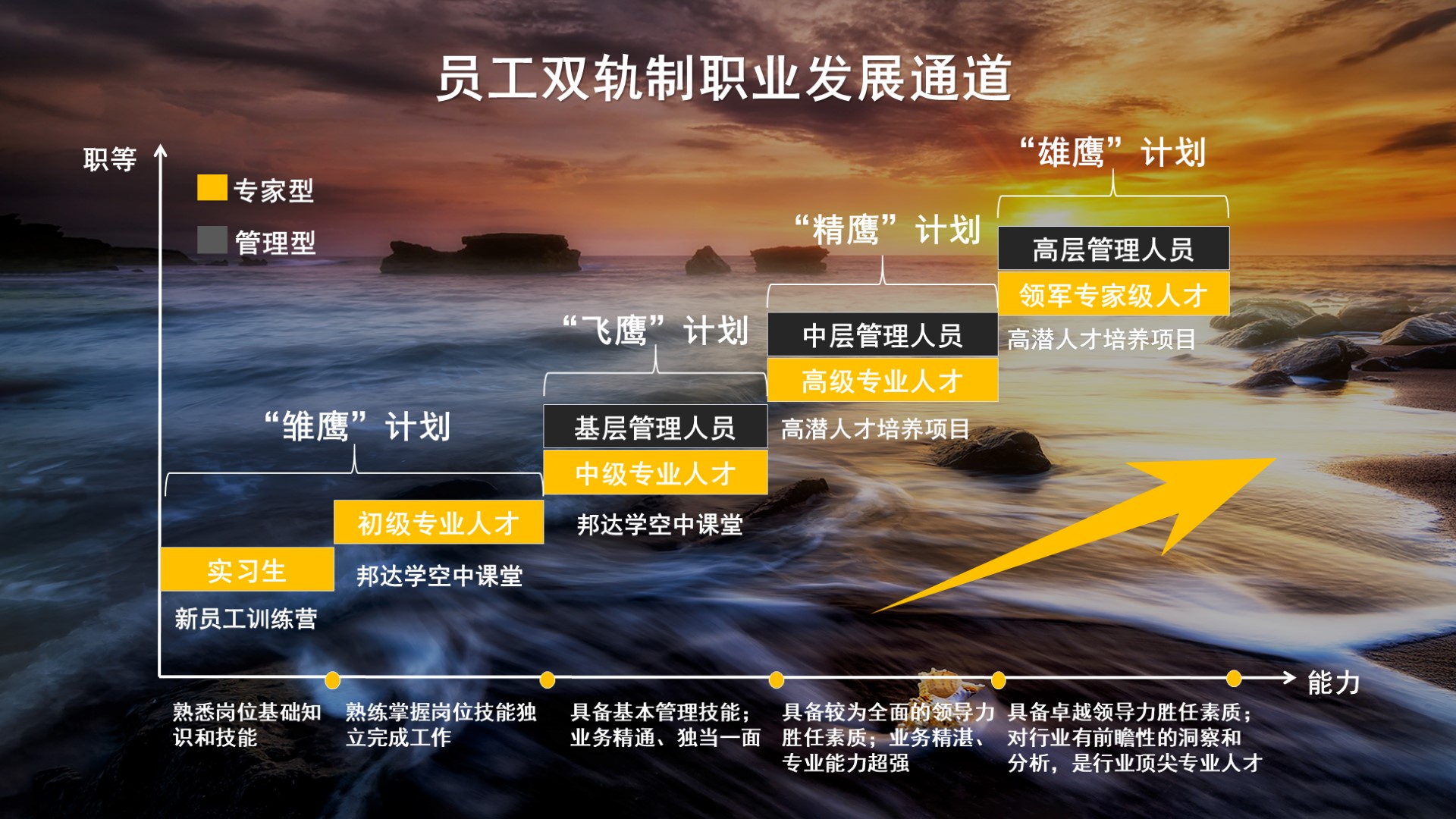 我们建立清晰的职级体系,推行双轨制职业发展通道,为员工提供多层级职业发展路径。